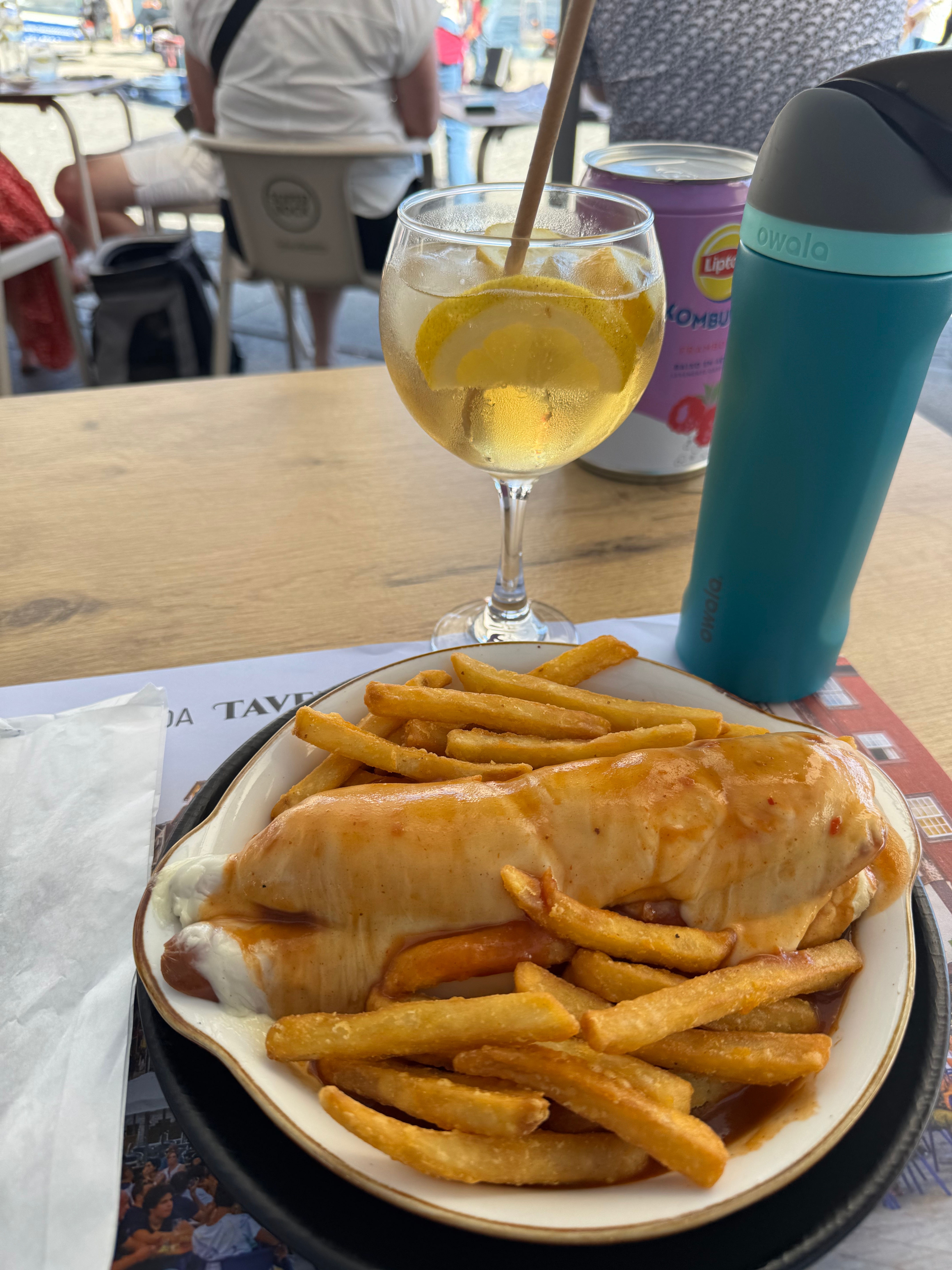 My introduction to the Ribera District was amazing. Sunshine, fresh air, amazing food/drinks and live music. I wandered around for a bit, just soaking in the vibe of the city before grabbing a café table and bite to eat along with a Port and Tonic (yes, G&T with port instead of G). My meal was a traditional hotdog dish – basically a few different processed meats, covered in cheese and slathered with red sauce. It was delicious and hit the spot after traveling. Now exhausted, I made my way back up to my hotel – no small feet in a vertical city, and crashed.