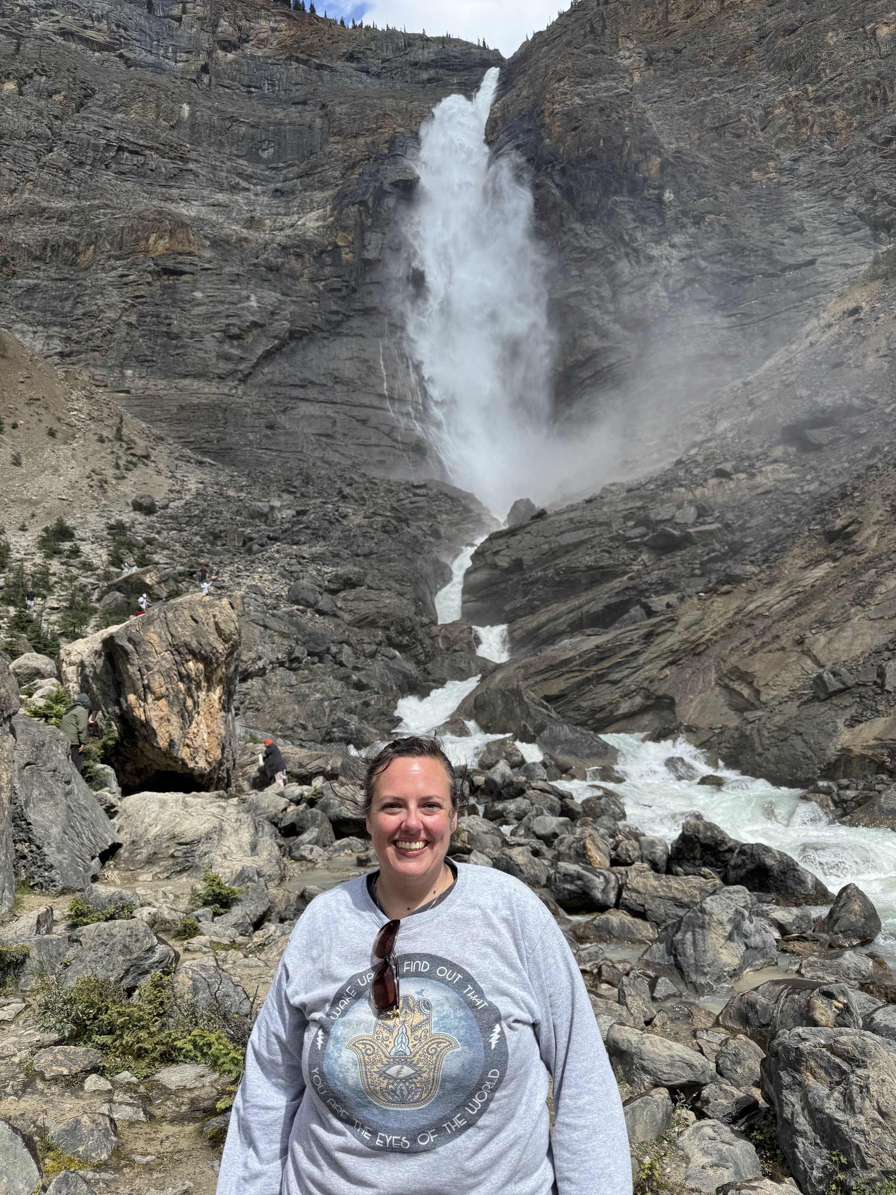 Our next stop, Takakkaw Falls. The drive took us over the continental divide and while this was not my first time doing so, it’s always an incredibly cool experience. If you’re not familiar, the continental divide basically runs through the Rockies (US and Canadian) and is where, among other things, the flow of fresh water changes direction. One side of the divide runs into the Pacific Ocean while the water on the other side runs to the Atlantic Ocean. You can actually see the water change direction and is a really cool natural phenomenon to see in person.